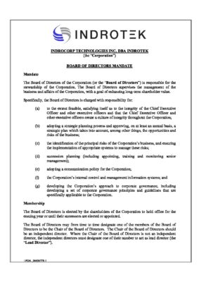 INDROCORP TECHNOLOGIES INC. DBA Indrotek._(1015982-281321)_Board Mandate (September 2021)