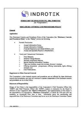 INDROCORP TECHNOLOGIES INC. DBA Indrotek._(1015982-281321)_Disclosure Controls and Procedures Policy (September 2021)